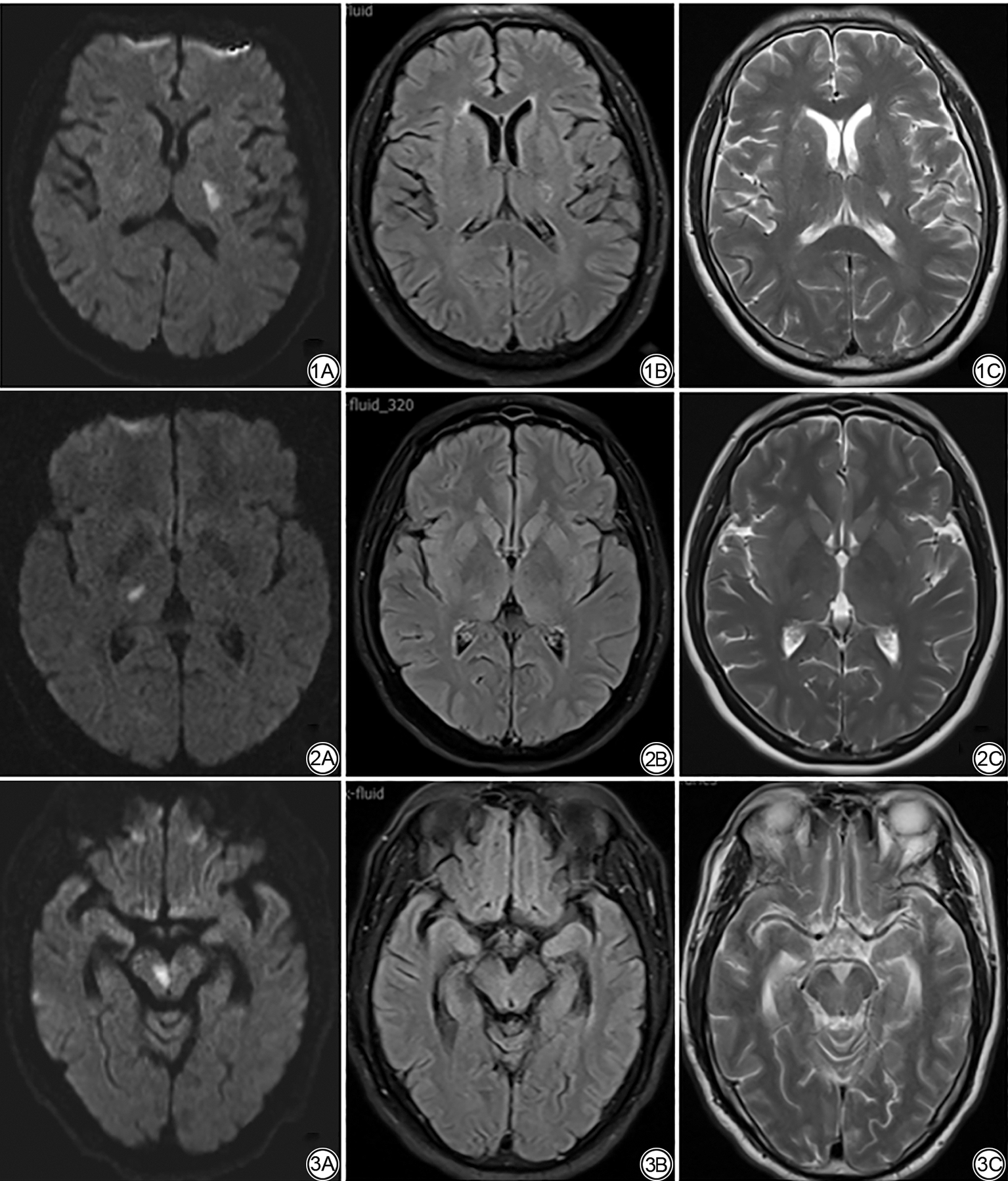 对所有患者于入院72 h内及随访时均行3.0 T头颅MRI(MAGNETOM Prisma, Siemens Healthcare, Erlangen, Germany)检查,包括T1加权成像(T1-weighted imaging, T1WI)、T2加权成像(T2-weighted imaging, T2WI)、液体衰减反转恢复(fluid attenuated inversion recovery, FLAIR)序列和DWI,部分患者在入院及随访时均加做磁敏感加权成像(susceptibility weighted imaging, SWI)检查。