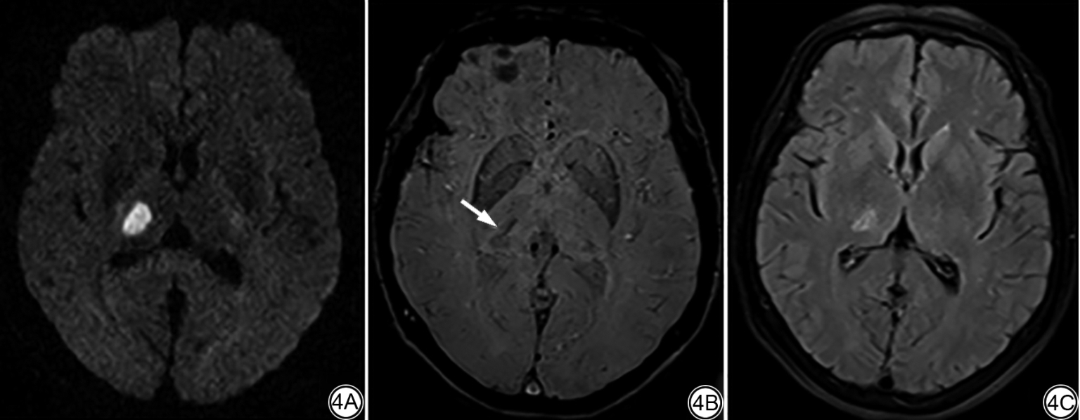 图4  女,59 岁,近期皮质下小梗死灶中出现HDs。4A:头颅DWI 示右侧丘脑梗死灶;4B~4C:随访1.3 个月后,SWI(4B)示病灶内线状低信号(箭),FLAIR(4C)示病灶内部分腔隙化。HDs:含铁血黄素沉积;DWI:弥散加权成像;SWI:磁敏感加权成像;FLAIR:液体衰减反转恢复。
