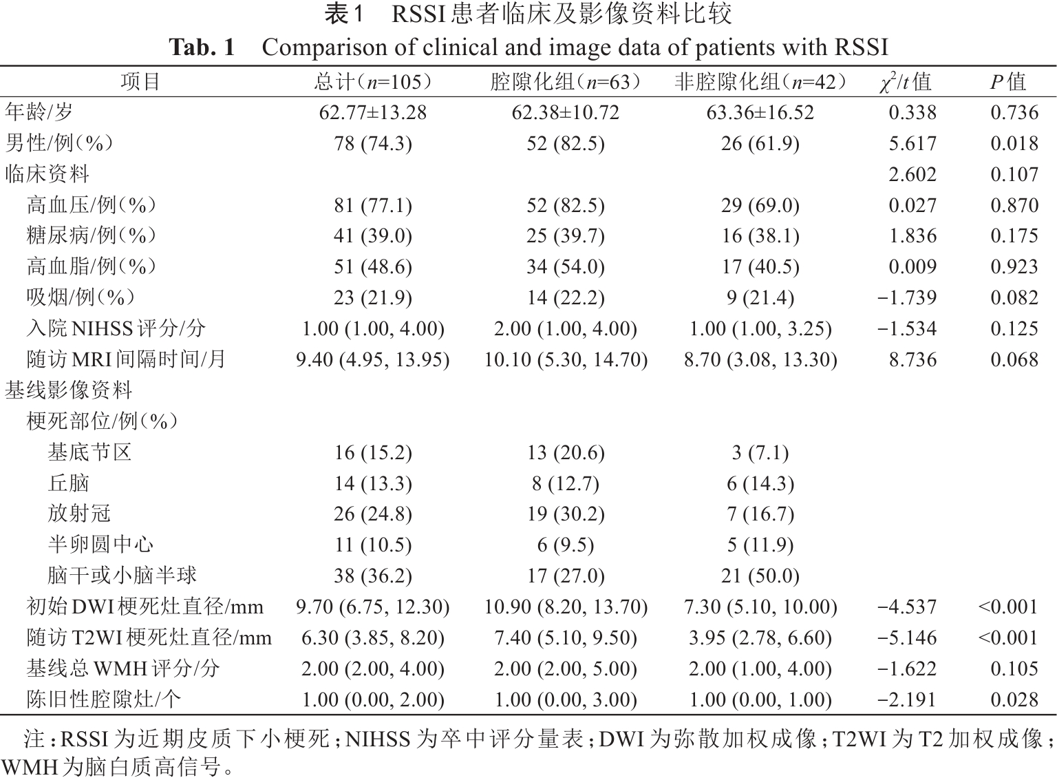 本研究结果显示RSSI腔隙化的患者占60%,与KWON等[20](58.2%)、WANG等[22](67.8%)结果相近。POTTER等[3]研究报道随访时间会影响RSSI病灶腔隙化,约五分之一有症状的梗死灶会发生明确的腔隙灶,腔隙化病灶的随访时间明显晚于非腔隙化病灶随访时间(中位时间228天比72天;P=0.0003);而LOOS等[4]研究显示RSSI腔隙化占比94%,他们认为在2年随访时间里几乎所有有症状的深部脑区梗死灶均会出现腔隙灶。有研究表明RSSI病灶演变在3个月后会趋于稳定[25]。本研究中腔隙化组与非腔隙化组间MRI随访时间差异无统计学意义,中位随访时间约9个月,虽然足以观察脑缺血性损伤后的胶质细胞增生,可能需继续随访观察病灶是否变化。