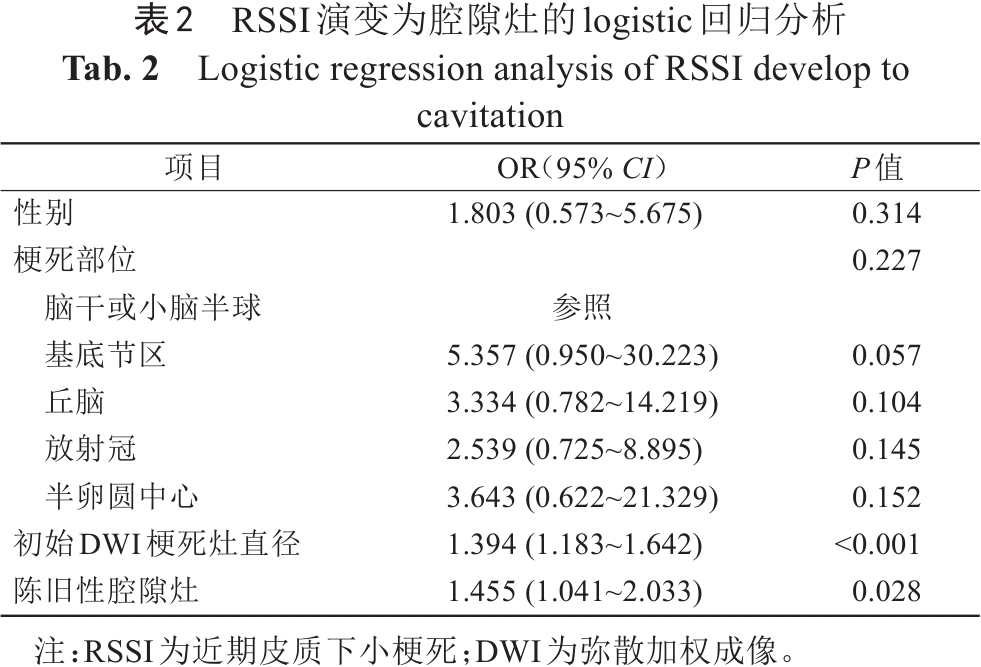将腔隙化组、非腔隙化组间性别、梗死灶部位、初始DWI梗死灶直径、陈旧性腔隙灶数量纳入logistic回归分析,在梗死部位中,以脑干或小脑半球组为参照,结果显示初始DWI梗死灶直径、陈旧性腔隙灶数量是RSSI演变为腔隙灶的独立预测因素(表2),性别、梗死灶部位(基底节区、丘脑、放射冠、半卵圆中心、脑干或小脑半球)均不是RSSI演变为腔隙灶的影响因素(表2)。