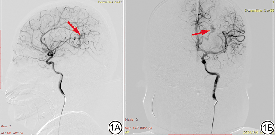 Fig. 1  DSA images of the internal carotid artery and the left vertebral artery. Male, 11 years old, admitted to the hospital due to cerebral hemorrhage and diagnosed with cerebral arteriovenous malformation. 1A: The arteriovenous malformation vessels are seen onthe left parietal lobe (red arrow). 1B: The blood supply artery originated from the left peri-capsular artery and drained into the left transverse sinus. The red arrow indicated the malformed vessel. DSA: digital subtraction angiography.
