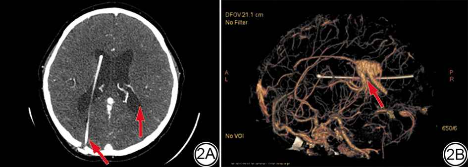 图2  CT平扫及CTA的VR成像立体图。男,11岁,因脑出血入院,确诊为脑动静脉畸形。2A:CT平扫显示右侧枕部见引流管影,左侧脑室后角见畸形血管影(红箭)。2B:CTA的VR立体成像,显示直窦血管稍粗,左侧横窦见增粗引流静脉影(红箭)。CT:计算机断层扫描;CTA:CT血管造影;VR:虚拟现实。