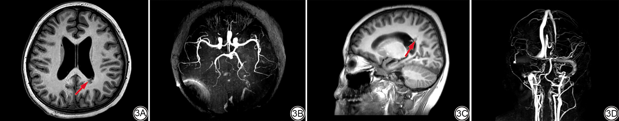 图3  男,11岁,因脑出血入院,确诊为脑动静脉畸形。3A和3B:T1WI轴位及矢状位图像可见左侧脑室后角斑片状等信号(红箭),其内可见血管流空影;3C:MRA左侧胼周动脉可见畸形血管显影(红箭);3D:MRV左侧横窦增粗可见与胼周动脉间异常血管相连。MRA:磁共振血管成像;MRV:磁共振静脉成像。