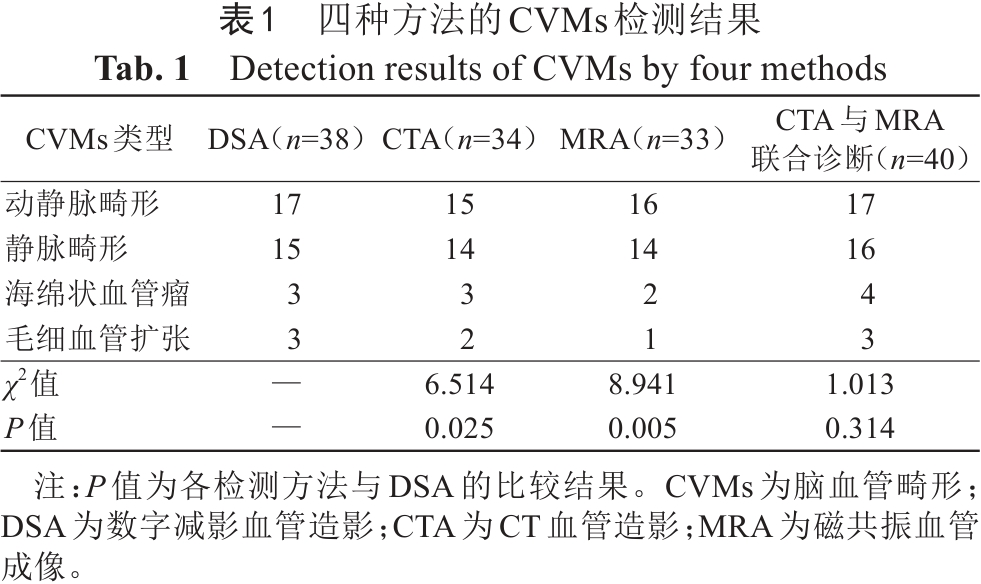 (1)CVMs的检出情况:分别统计分析DSA、CTA和MRA影像学检查方法检出的不同类型CVMs(动静脉畸形、静脉畸形、海绵状血管瘤和毛细血管扩张)的数量,比较3种方法检出的不同类型CVMs的差异。