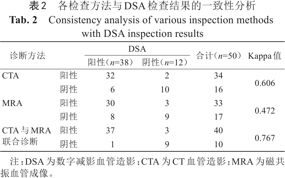 (2)CTA、MRA与金标准DSA诊断的一致性:以DSA诊断结果(阳性/阴性)为金标准,分别统计CTA与MRA的诊断结果(阳性/阴性),采用Kappa检验初步分析CTA、MRA与DSA诊断的一致性。
