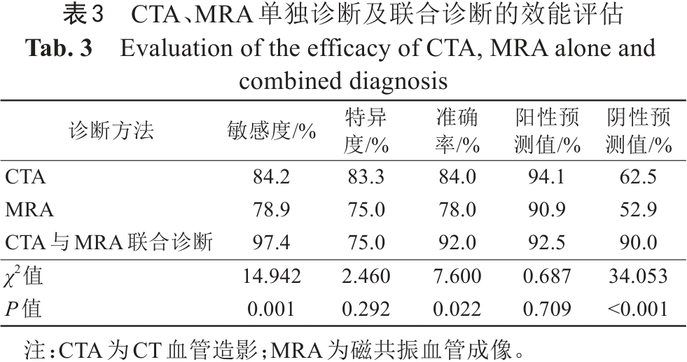 Tab. 3  Evaluation of the efficacy of CTA, MRA alone and combined diagnosis