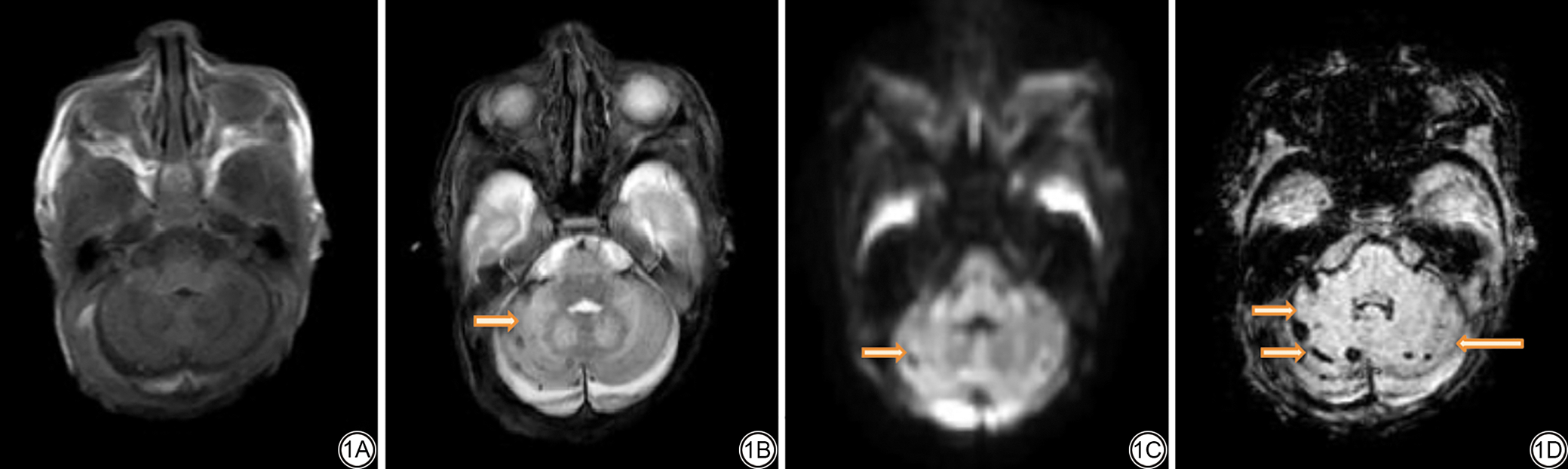 图1  女,胎龄40+1周,宫内窘迫。1A:在T1WI上双侧小脑半球未见明显异常信号;1B:在T2WI上右侧小脑半球可见点状低信号出血影;1C:在DWI上右侧小脑半球可见低信号;1D:在SWI上双侧小脑半球可见多发点状低信号出血影。T1WI:T1加权成像;T2WI:T2加权成像;DWI:扩散加权成像;SWI:磁敏感加权成像。