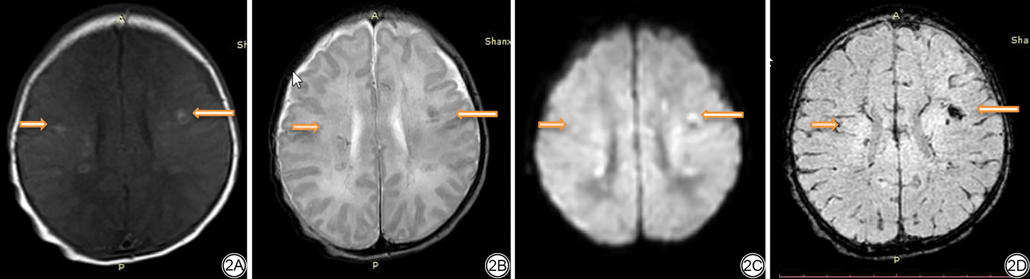 图2  女,胎龄39周,肩难产。2A示T1WI双侧侧脑室旁白质内斑片状高信号;2B示T2WI双侧侧脑室旁白质斑片状低信号;2C示DWI序列相应部位呈高信号,局部可见低信号;2D示SWI序列相应病灶呈低信号。提示PWML合并出血。T1WI:T1加权成像;T2WI:T2加权成像;DWI:扩散加权成像;SWI:磁敏感加权成像;PWML:局灶性脑白质损伤。