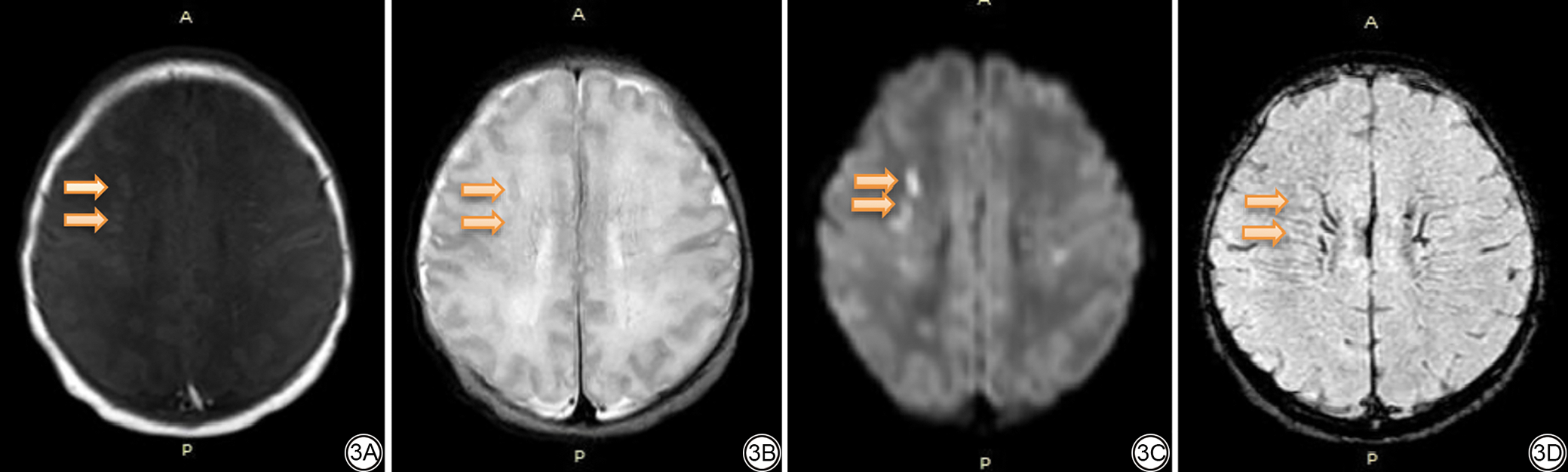Fig. 3  Scans of a premature female (gestational age = 35+2 weeks). 3A: The right paraventricular area exhibited a high T1WI signal shadow; 3B: The right paraventricular area exhibited a low T2WI signal shadow; 3C: DWI of the bilateral paraventricular area showing a high signal shadow; 3D: The corresponding region on SWI, showing other signals suggestive of ischemic white matter lesion without bleeding. T1WI: T1-weighted images; T2WI: T2-weighted images; DWI: diffusion-weighted imaging; SWI: susceptibility-weighted imaging.