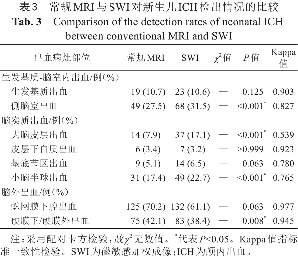 表3  常规MRI与SWI对新生儿ICH检出情况的比较