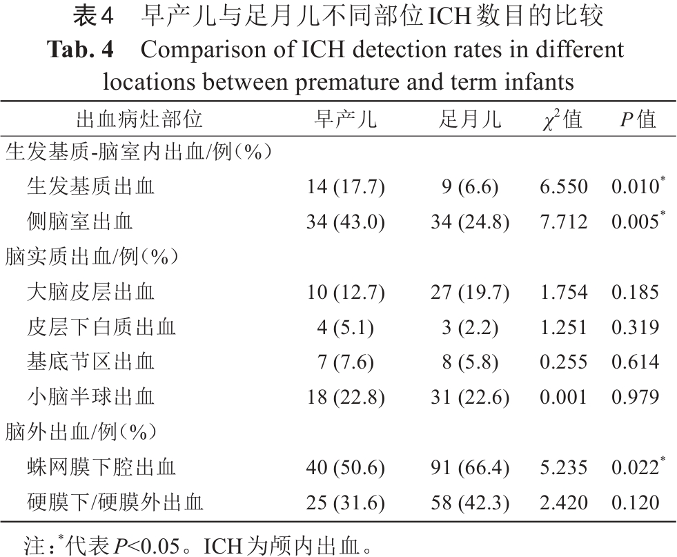 表4  早产儿与足月儿不同部位ICH数目的比较