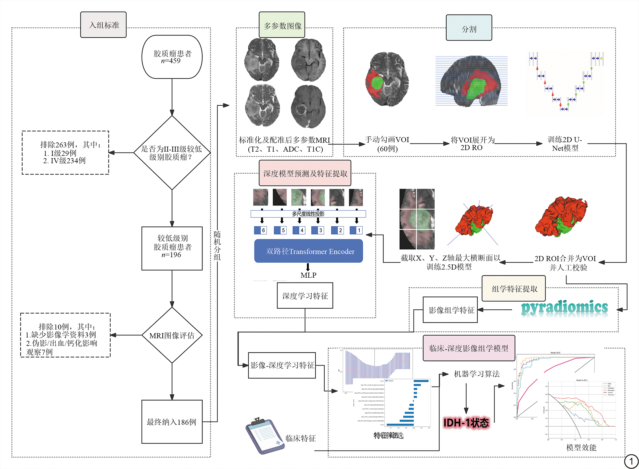 目前,IDH-1突变状态的检测主要依赖于病理组织的基因检测和免疫组化,存在着有创、费用高、耗时长和取样偏差等局限性。因此,开发一种非侵入性、方便、高效的检测手段是目前亟待解决的问题[5]。影像组学及深度学习作为从医学影像中提取多维特征的新兴技术,能够从感兴趣区(region of interest, ROI)中获取大量与病理相关的潜在信息[6, 7, 8]。随着MRI在胶质瘤临床诊断中的常规应用,基于MRI的影像组学及深度学习被视为一种有前景的无创手段,用于预测胶质瘤患者的IDH-1突变状态[9, 10, 11, 12]。但现阶段IDH-1相关的研究还主要集中在所有的胶质瘤或高级别胶质瘤,忽略了LGGs的特殊性[13, 14, 15]。另外少数关注LGGs患者IDH状态的影像学研究也主要基于单参数或双参数MRI在瘤内区域进行影像组学模型的构建[9, 16, 17]。然而,在胶质瘤中,瘤周水肿并非单纯的继发性改变,而是与肿瘤的生物学行为、恶性程度及分子特征密切相关的重要指标[18, 19]