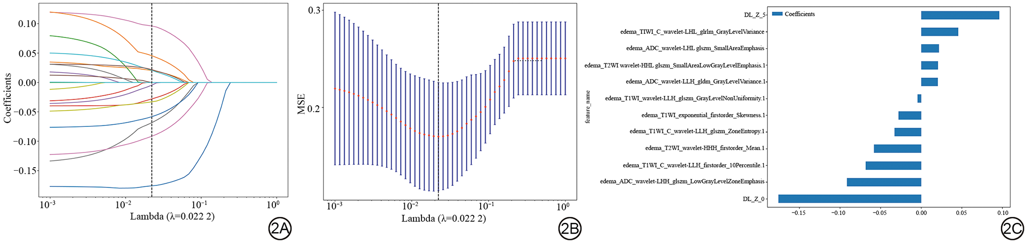 图2  利用最小绝对收缩和选择算子(LASSO)筛选预测较低级别胶质瘤异柠檬酸脱氢酶基因状态的深度影像组学特征的过程;2A:LASSO降维10折交叉验证在不同λ下所对应的系数;2B:LASSO降维10折交叉验证在不同λ下所对应的均值标准误差(MSE);2C:经过特征筛选后所保留的深度影像组学特征的具体名称及所对应的系数。