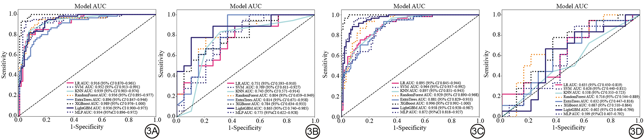 图3  训练组和验证组中多个机器学习算法构建的深度影像组学模型(3A表示训练组,3B表示验证组)及单纯影像组学模型(3C表示训练组,3D表示验证组)预测较低级别胶质瘤异柠檬酸脱氢酶基因状态的受试者工作特征曲线。AUC:曲线下面积;LR:逻辑回归;SVM:支持向量机;KNN:k近邻算法;ExtraTrees:极端随机树;XGBoost:极限梯度提升;LightGBM:轻量梯度提升机;MLP:多层感知机。