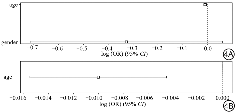 Fig. 4  Forest plots of odds ratio (OR) confidence intervals (CI) for variables in univariate and multivariate logistic analysis of isocitrate dehydrogenase gene status in lower-grade gliomas in the training set. 4A: Univariate logistic analysis; 4B: Multivariate logistic analysis.