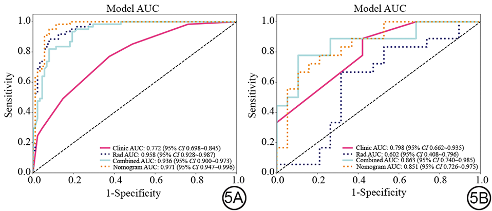 图5  训练组(5A)和验证组(5B)中多个机器学习算法构建的临床-深度影像组学的nomogram模型预测较低级别胶质瘤异柠檬酸脱氢酶基因状态的受试者工作特征曲线。Combined表示深度影像组学模型标签。