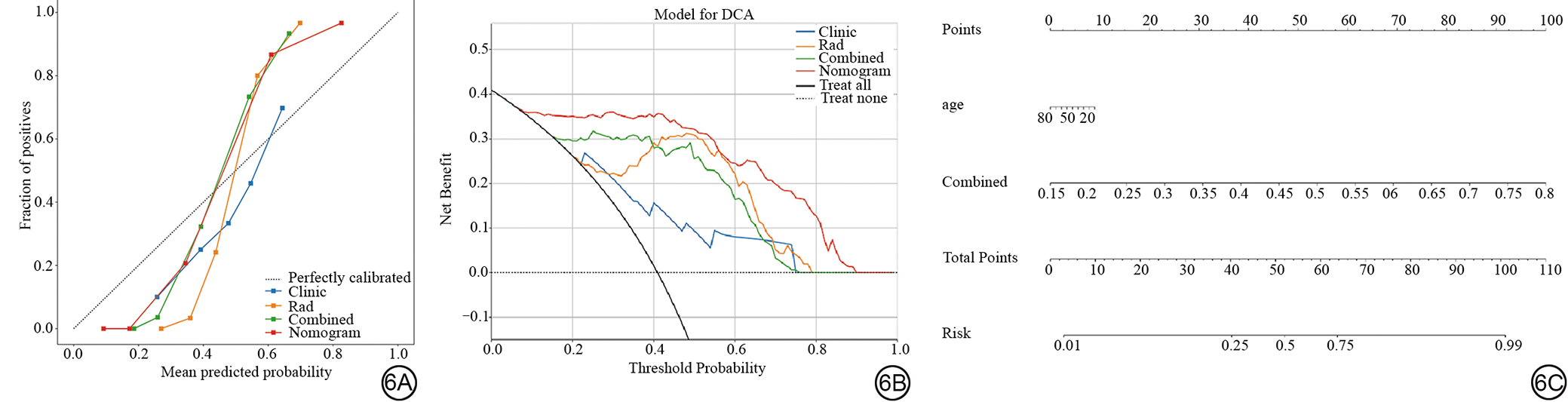 图6  Nomogram模型曲线图。6A:训练组的校准曲线;6B:临床模型、影像组学模型、深度影像组学及临床深度影像组学模型的决策曲线;6C:临床-深度影像组学模型的列线图。Combined表示深度影像组学模型标签。