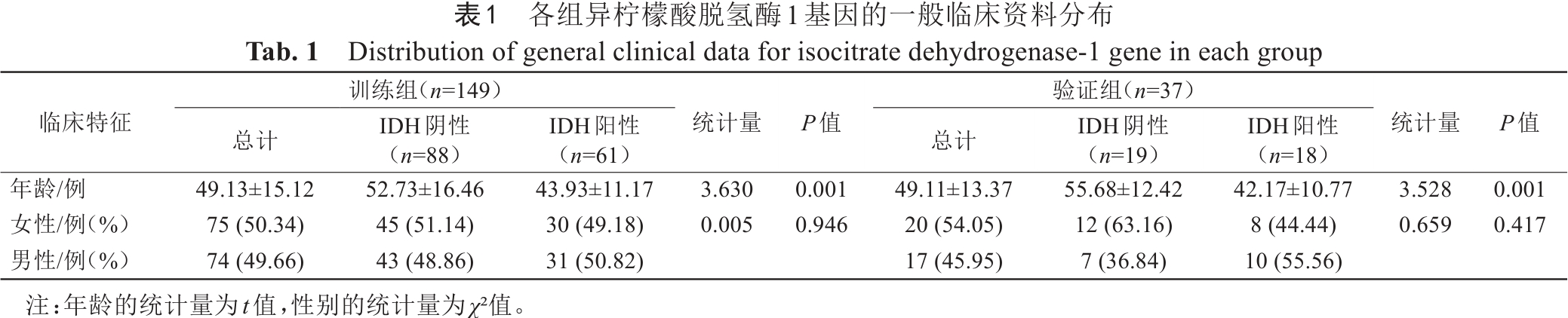 根据纳入和排除标准共纳入186例患者,其中IDH-1阳性79例,阴性107例。患者年龄和性别分布见表1。训练组中男74例,女75例,年龄(49.13±15.12)岁;验证组中男17例,女20例,年龄(49.11±13.37)岁。IDH-1阳性患者的年龄显著小于阴性患者,差异具有统计学意义(P<0.05)(表1)。本研究还进一步分析了年龄、性别与组别分配之间的交互效应,结果未发现显著的交互作用(所有P值均>0.05)。