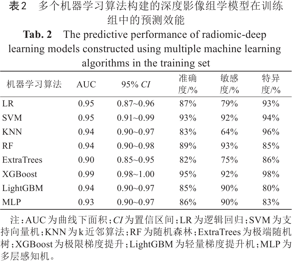 表2  多个机器学习算法构建的深度影像组学模型在训练组中的预测效能