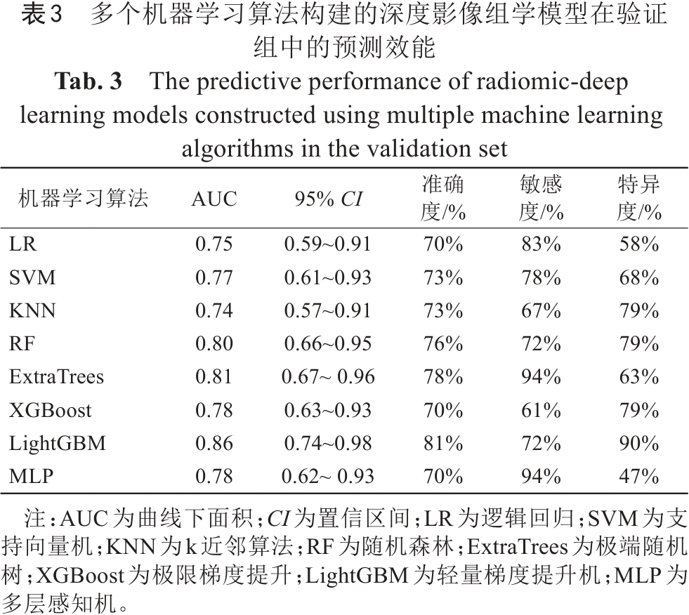 表3  多个机器学习算法构建的深度影像组学模型在验证组中的预测效能
