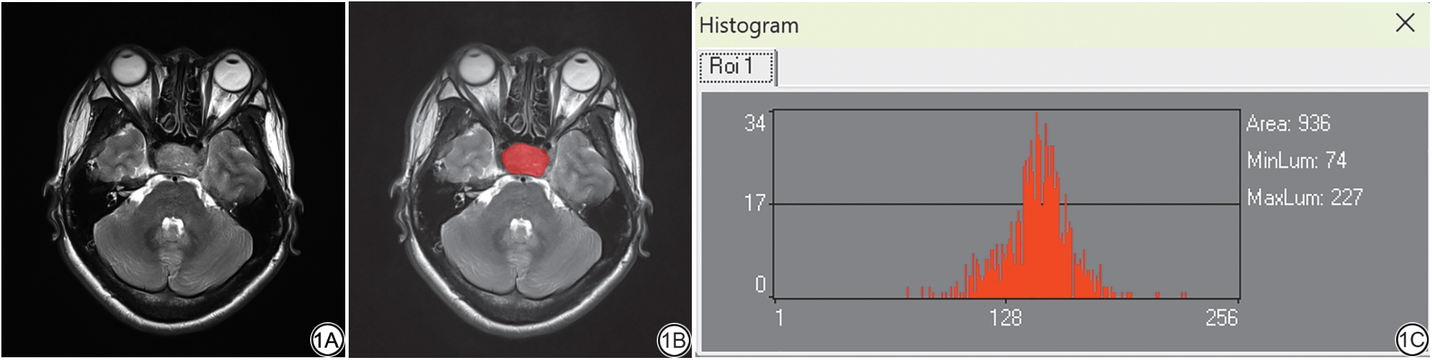 Fig. 1  Male, 43 years old, with persistent poor postoperative outcome. 1A: Axial T2WI image of the tumor's maximum section; 1B: The ROI delineated on the axial T2WI of the tumor, filled in red; 1C: Histogram analysis of the ROI. ROI: region of interest.