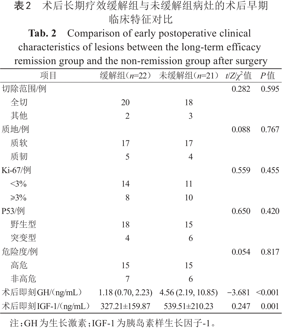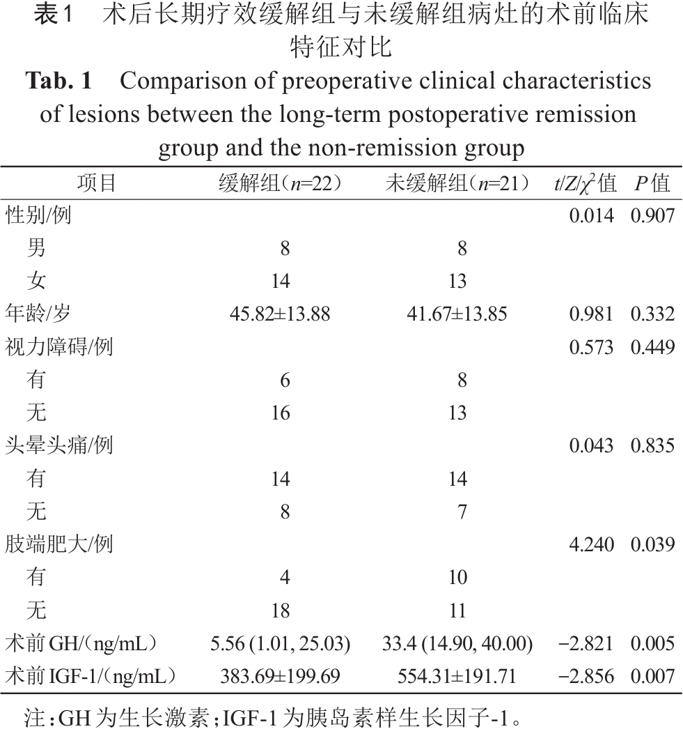 本研究共入组43例患者,依据术后随访结果分为两组,其中术后缓解组22例,未缓解组21例。两组患者在性别、年龄、是否有视力障碍、有无头晕头痛方面差异无统计学意义(P>0.05)。两组患者在术前是否具有肢端肥大、术前GH、IGF-1激素水平方面差异具有统计学意义(P<0.05)(表1)。