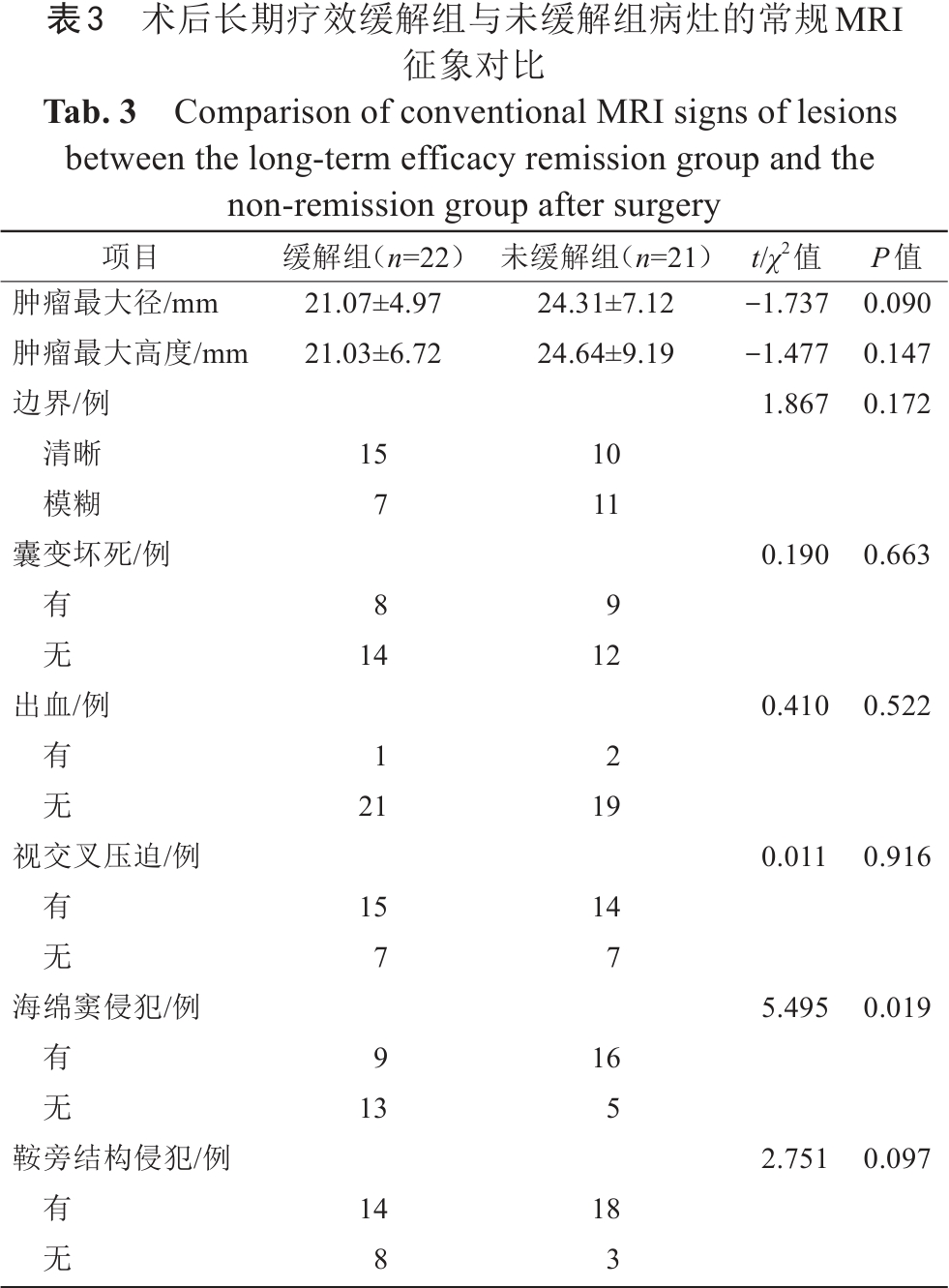 Tab. 3  Comparison of conventional MRI signs of lesions between the long-term efficacy remission group and the non-remission group after surgery