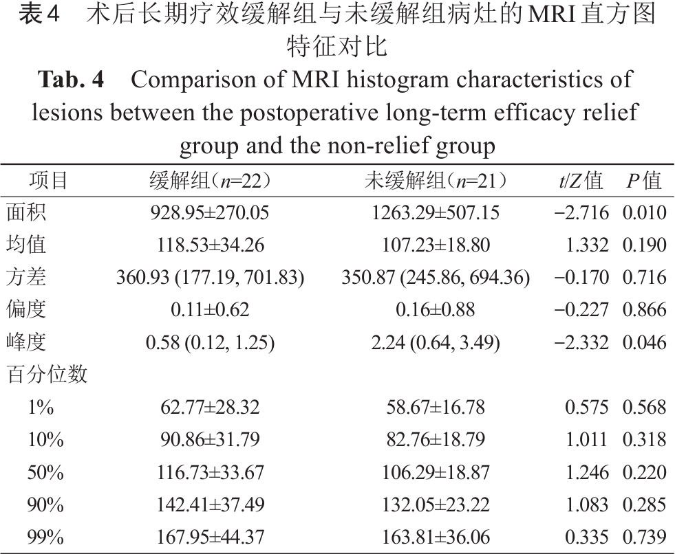 Tab. 4  Comparison of MRI histogram characteristics of lesions between the postoperative long-term efficacy relief group and the non-relief group