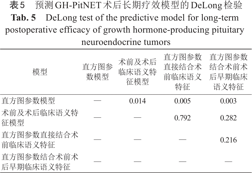 表5  预测GH-PitNET术后长期疗效模型的DeLong检验