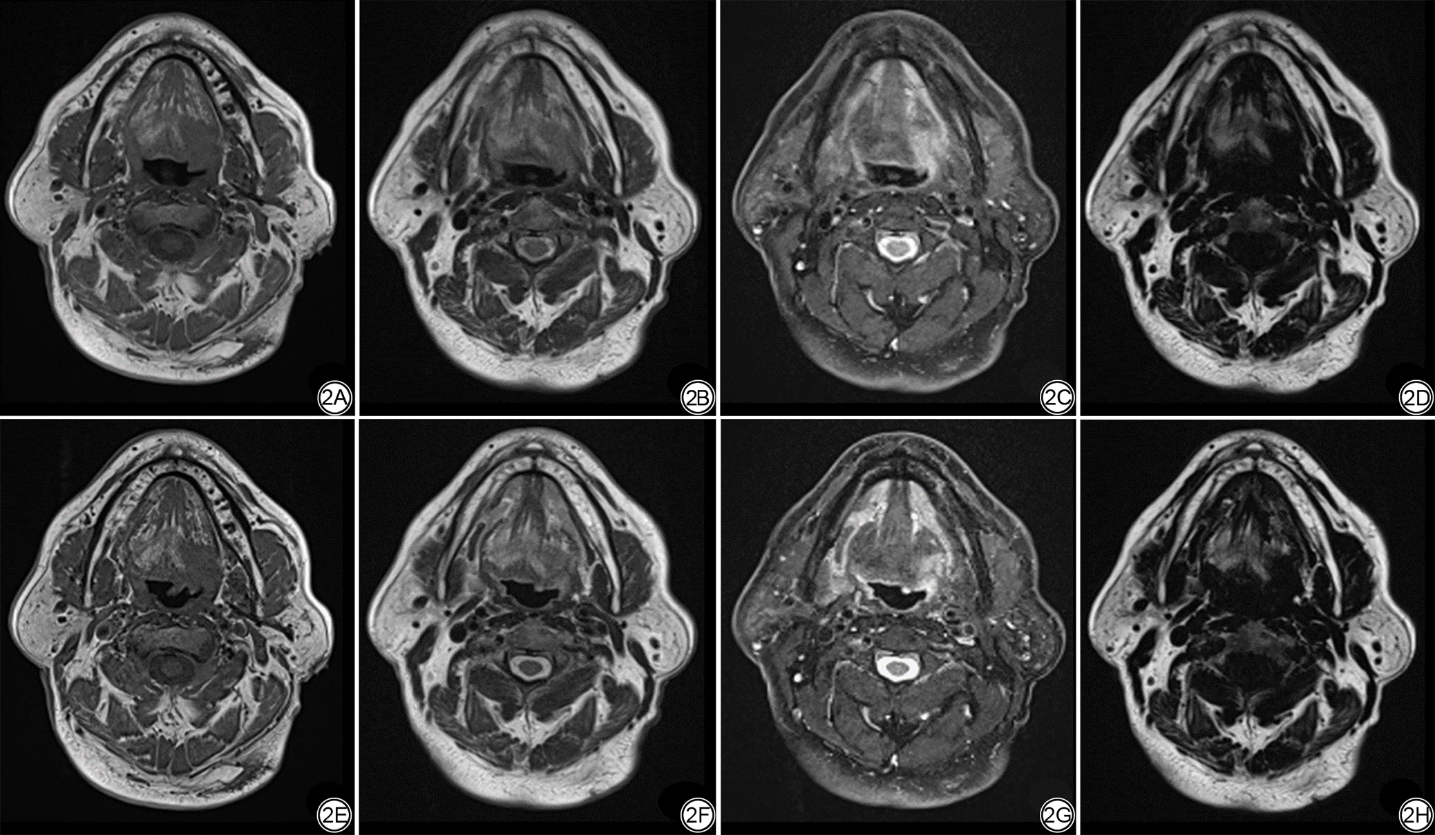 Fig. 2  A 63-year-old male presented with a tongue tumor discovered 3 weeks prior and underwent examination at our hospital. The standard T1WI sequence (2A), standard T2WI-Dixon-Inphase sequence (2B), Water sequence (2C), and Fat sequence (2D), as well as the DL-T1WI sequence (2E), DL-T2WI-Dixon-Inphase sequence (2F), Water sequence (2G), and Fat sequence (2H), all clearly visualized the lesion, with overall excellent image quality. T1WI: T1 weighted imaging; T2WI: T2 weighted imaging; DL: deep learning.
