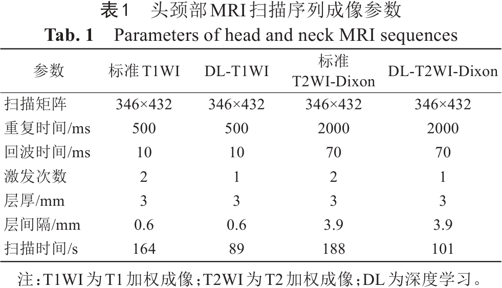 本研究采用西门子医疗3.0 T磁共振成像仪(MAGNETOM Vida, Siemens Healthcare, Erlangen, Germany)进行扫描,图像采集使用20通道头颈联合线圈完成。所有患者均采取仰卧位、头先进的方式进行扫描,扫描范围从口咽部至颈根部。所有序列均采用横断位扫描,扫描序列包括:标准T1WI、标准T2WI-Dixon、使用DL重建的加速T1WI(DL-T1WI)序列和使用DL重建后的加速T2WI-Dixon(DL-T2WI-Dixon)序列,扫描参数详见表1。在标准T2WI-Dixon序列和DL-T2WI-Dixon序列中分别包含三组图像(Water像、Inphase像和Fat像),因此扫描序列共有8组图像,分别为:标准T1WI、DL-T1WI、标准T2WI-Dixon-Water像、标准T2WI-Dixon-Inphase像、标准T2WI-Dixon-Fat像、DL-T2WI-Dixon-Water像、DL-T2WI-Dixon-Inphase像、DL-T2WI-Dixon-Fat像。