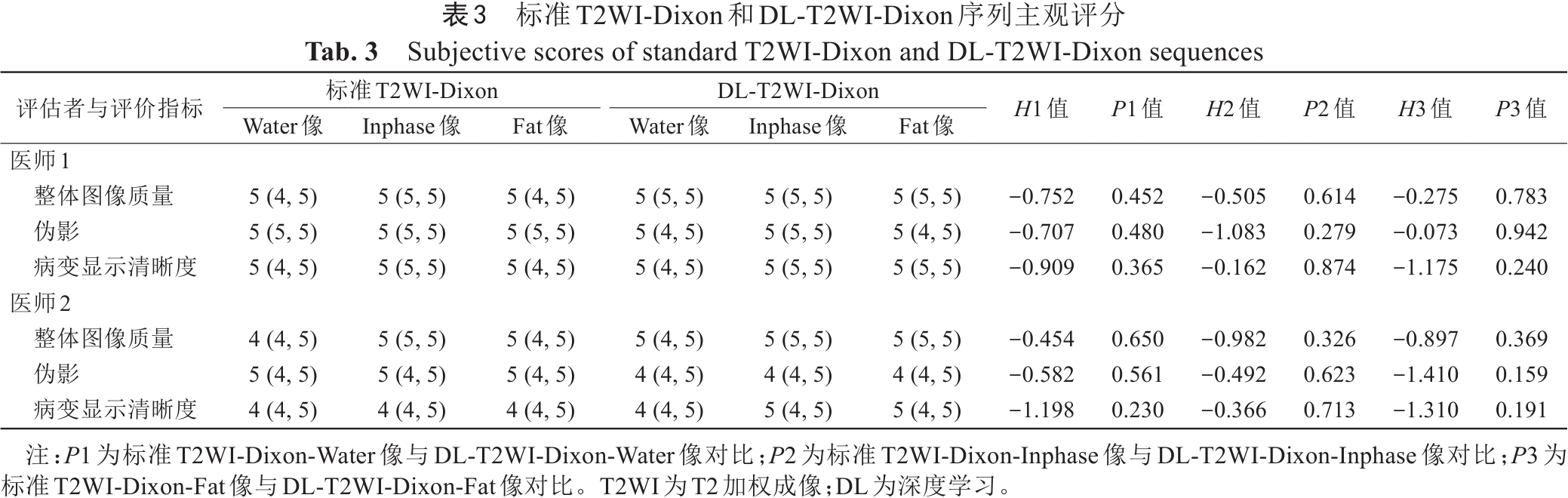 Tab. 3  Subjective scores of standard T2WI-Dixon and DL-T2WI-Dixon sequences