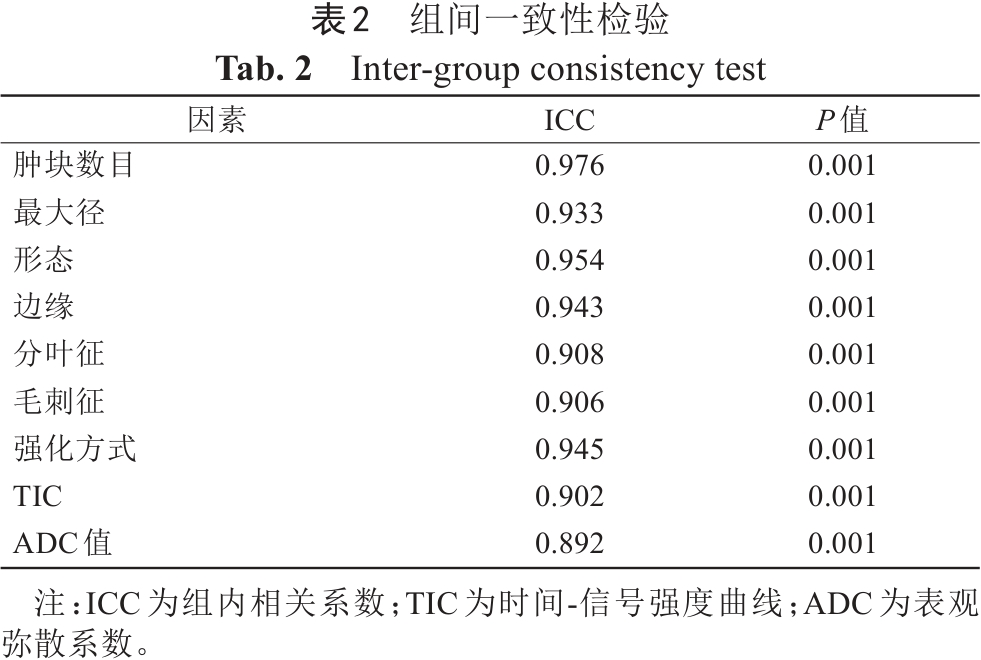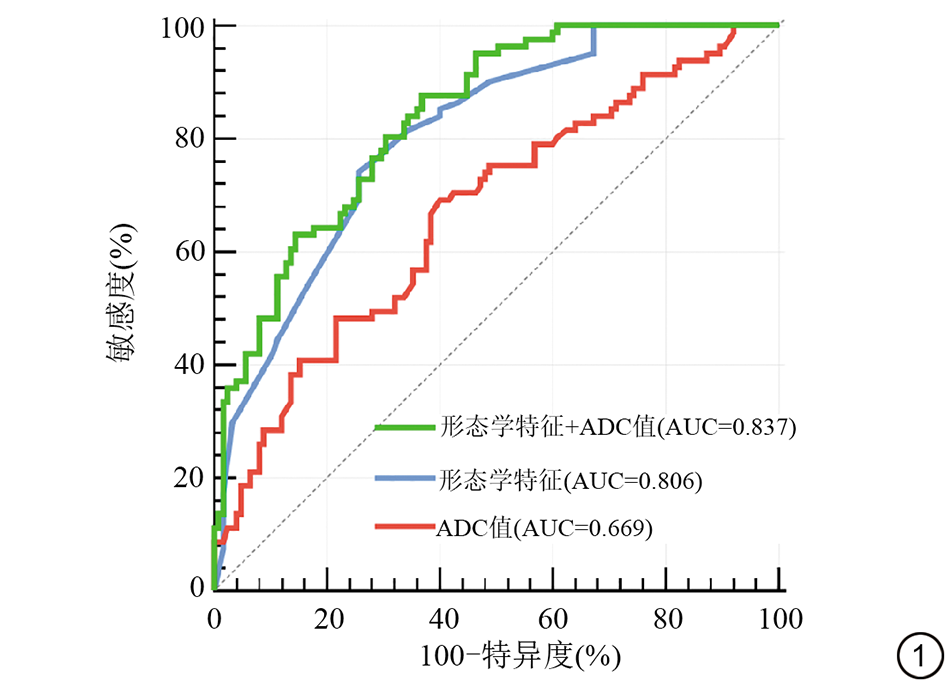 (1)肿瘤形态学特征:肿块数目(单灶、多灶)、最大径(≤2 cm、>2 cm)、肿块形态(规则、不规则)、边缘(清晰、不清晰)、分叶征(有、无)、毛刺征(有、无)、强化方式(均匀强化、不均匀强化、环形强化)。(2)TIC分为三型:Ⅰ型(流入型),即增强后信号强度持续升高并超过早期强化峰值的10%;Ⅱ型(平台型),即增强后信号强度上升达到峰值后变化不超过10%;Ⅲ型(流出型),即增强后信号强度上升达峰值后降低超过早期强化峰值的10%。(3)ADC值:参照MRI增强扫描第3期图像对病灶进行精准定位,选取表现为明显强化或DWI明显高信号作为感兴趣区(region of interest, ROI)。