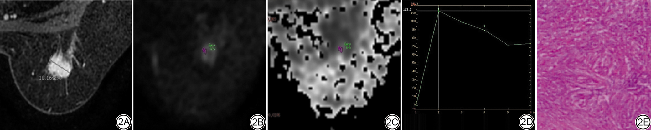 图2  女,44岁,HR阳性表达乳腺癌。2A:动态增强图像,右乳肿块样强化病变的最大径约18.16 mm,边缘不光滑,可见毛刺征,内部不均匀强化;2B:DWI图像(b值=1000 mm2/s),DWI呈不均匀稍高信号;2C:ADC值为0.985×10-3 mm2/s;2D:TIC为Ⅲ型(流出型);2E:免疫组化示ER阳性(约95%),PR阳性(约80%)。HR:激素受体;DWI:弥散加权成像;ADC:表观弥散系数;TIC:时间-信号强度曲线;ER:雌激素受体;PR:孕激素受体。