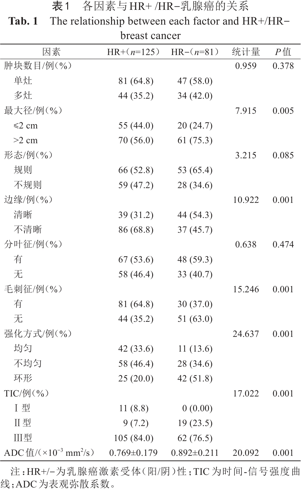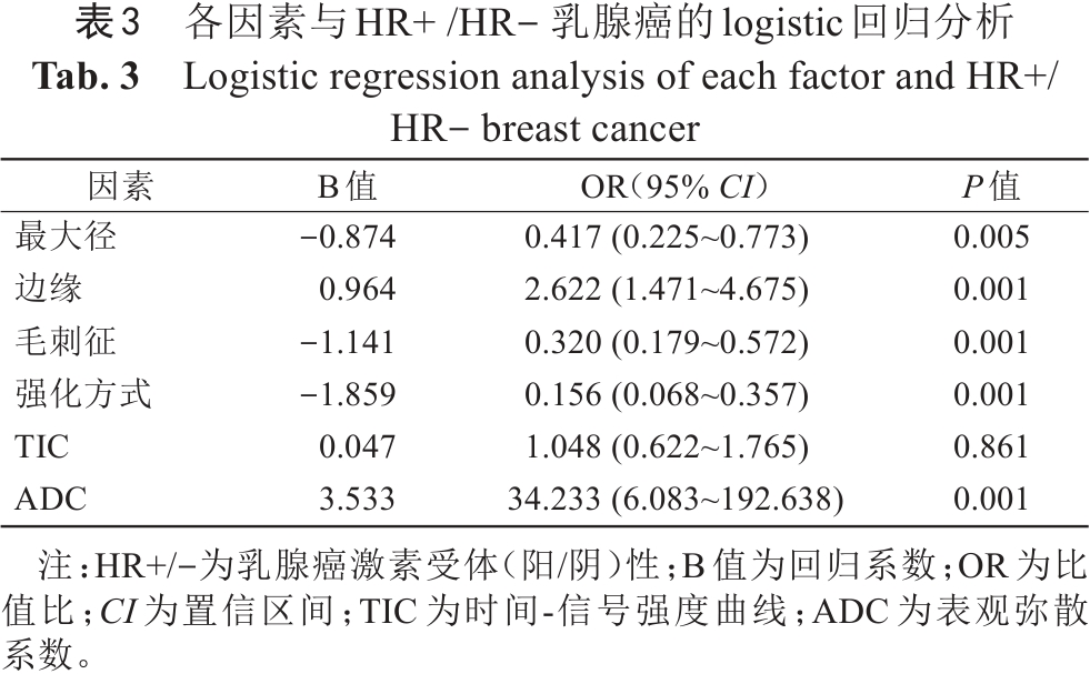 本研究206例患者中,HR+病灶125例(60.7%),HR-病灶81例(39.3%)。HR表达不同时,病灶的最大径、边缘、毛刺征、强化方式、TIC、ADC值差异均具有统计学意义(P<0.05)(表1)。