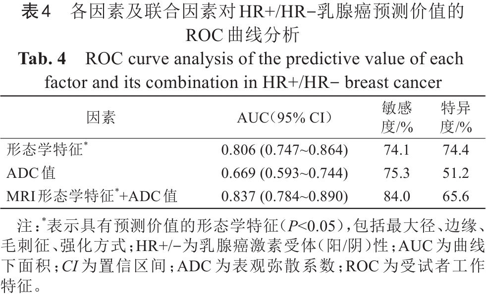 综上所述,HR+患者的更容易表现为最大径≤2 cm、边缘不光滑、可见毛刺、不均匀强化、TIC为Ⅲ型曲线和较低的ADC值,MRI形态学特征(肿瘤最大径、边缘、毛刺征、强化方式)、ADC值可在一定程度上预测乳腺癌HR的表达状态,且二者联合模型的预测价值最高,可以为临床治疗方案的制订和调整提供更多的参考依据。