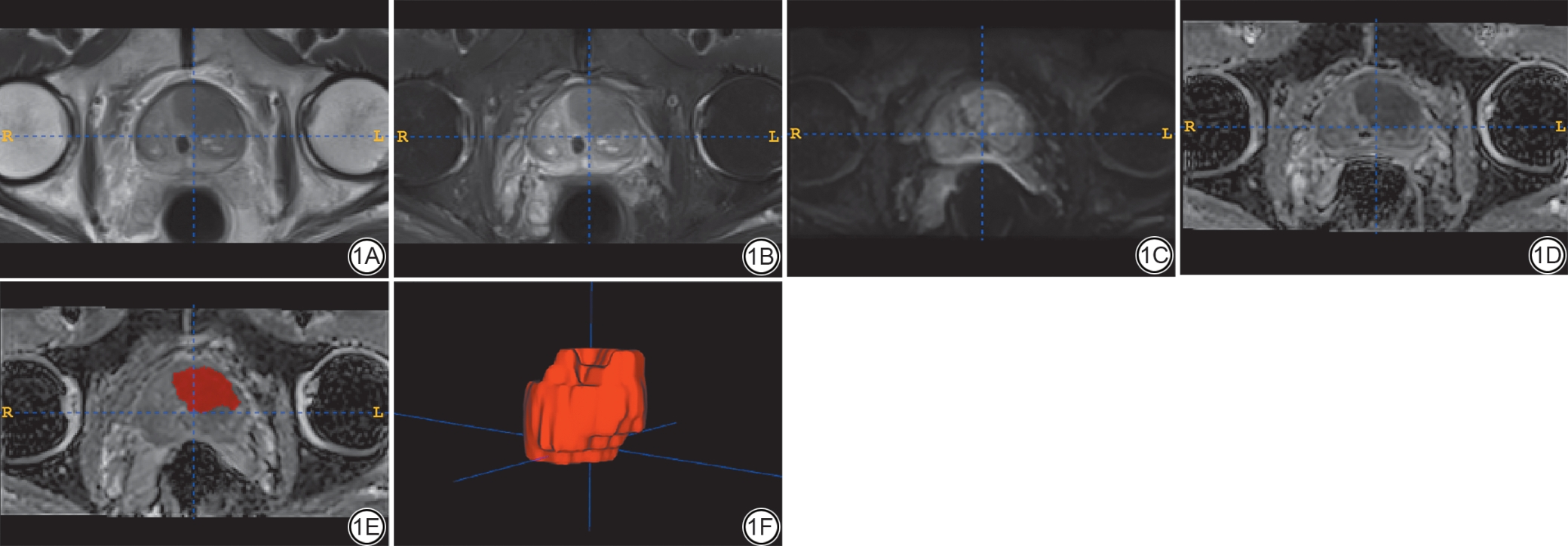 Fig. 1  Male, 69-year-old, a prostate cancer patient, red represents the ROI. 1A: T2WI image; 1B: T2WI-FS image; 1C: ZOOMit-DWI (b = 1000 s/mm2) image; 1D: ZOOMit-ADC image; 1E: Two-dimensional ROI image based on ZOOMit-ADC; 1F: Three-dimensional ROI image. ROI: region of interest; FS: fat suppression; DWI: diffusion weighted imaging; ADC: apparent diffusion coefficient.