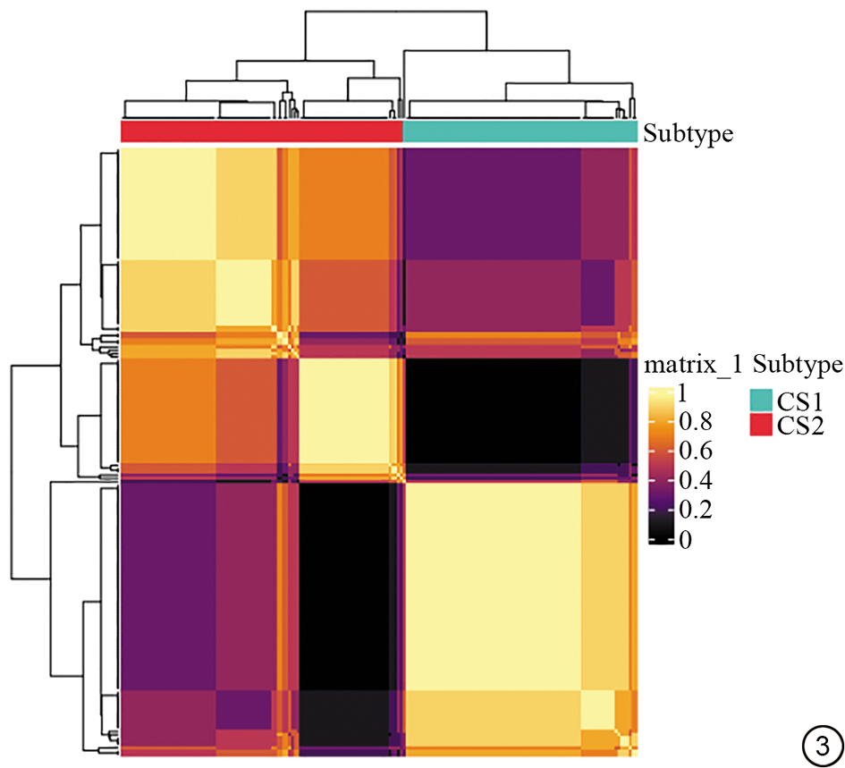 图3  2种聚类亚型采用10种聚类分析方法得到的聚类一致性矩阵。具体操作,每个算法得到NumberN矩阵(N为患者数),矩阵的每个元素表示是否将两个患者分成一组(如果将患者1和患者2分成一组,则矩阵的第一行,第二列为1,改为0),然后将10种算法的矩阵相加,得到一个合并矩阵。根据合并矩阵,采用HC(层次聚类)进行聚类,得到最终的分组结果。