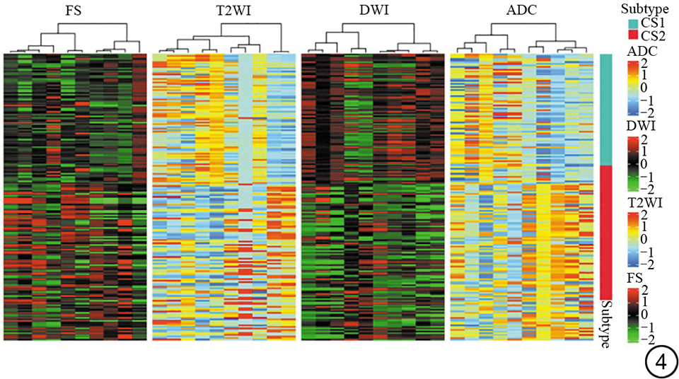 图4  基于前列腺多参数成像特征(T2WI、T2WI-FS、ZOOMit-DWI、ZOOMit-ADC)热图。热图显示影像组学特征在两种聚类之间分布不同。FS:脂肪抑制;DWI:扩散加权成像;ADC:表观扩散系数。