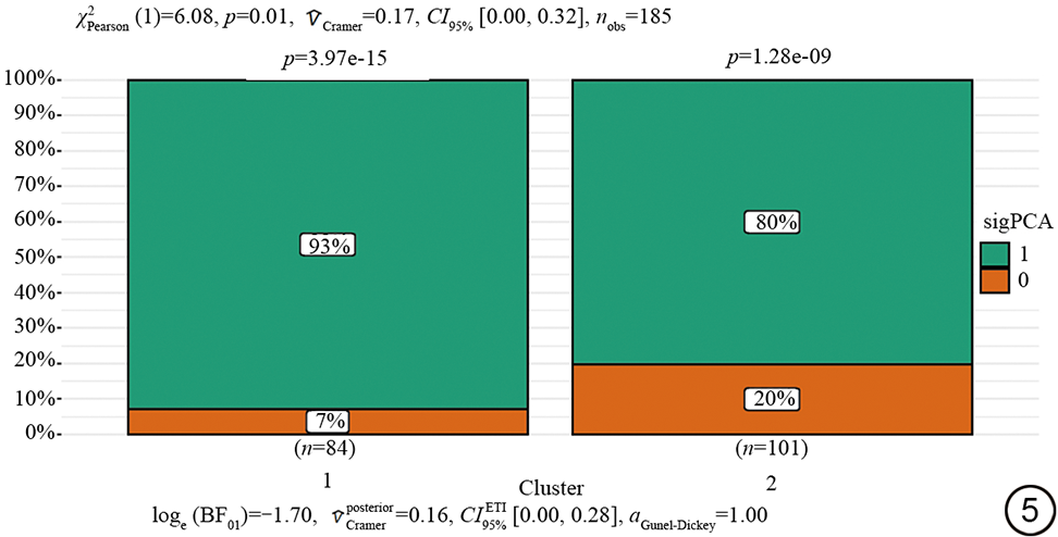 两种聚类亚型与临床病理特征之间的相关性分析(表2)显示年龄及PV差异没有统计学意义(P>0.05)。sigPCA的发病率两组分别为92.857%(78/84)和80.198(81/101),聚类1型显示sigPCA发生率较高,差异有统计学意义(P<0.05),并生成了如图5所示的柱状图。采用Gleason评分系统对PCA进行评估。结果显示,在聚类1型中,4+3分的比例最高(32.143%),其次是3+4和5+4分(均为15.476%)。在聚类2型中,3+4分的比例最高(26.733%),两组聚类亚型3+5和5+3的比例一样。两种聚类亚型之间的Gleason评分差异存在统计学意义(P=0.035)。两组患者的Ki-67及PSA的表达方面差异没有统计学意义(P>0.05)。在P504S表达方面,聚类2型的比例较高(91.089%),两组差异有统计学意义(P<0.05)。两组的脉管内可见侵犯及PNI发生率差异无统计学意义(P>0.05)。聚类1型的LNM发生率21.429%高于聚类2型的8.911%,差异显著。