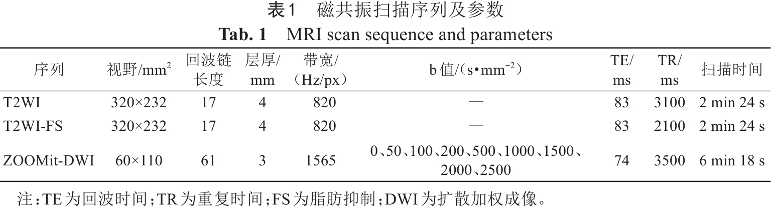 采用配备18通道相控阵体线圈的西门子3.0 T超导MRI进行图像采集。扫描序列包括轴向T2WI、T2WI-FS和ZOOMit-DWI。具体参数详见表1
