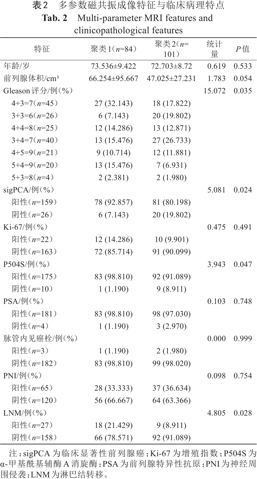 共有185例PCA患者符合纳入标准PCA,159例为sigPCA,26例为NcsPCA。患者中最常见的Gleason评分为4+3(45例)和3+4(40例)。175例患者P504S检测呈阳性,而10例P504S检测呈阴性;181例患者PSA阳性,4例PSA阴性;27例有LNM,65例有PNI。详见表2