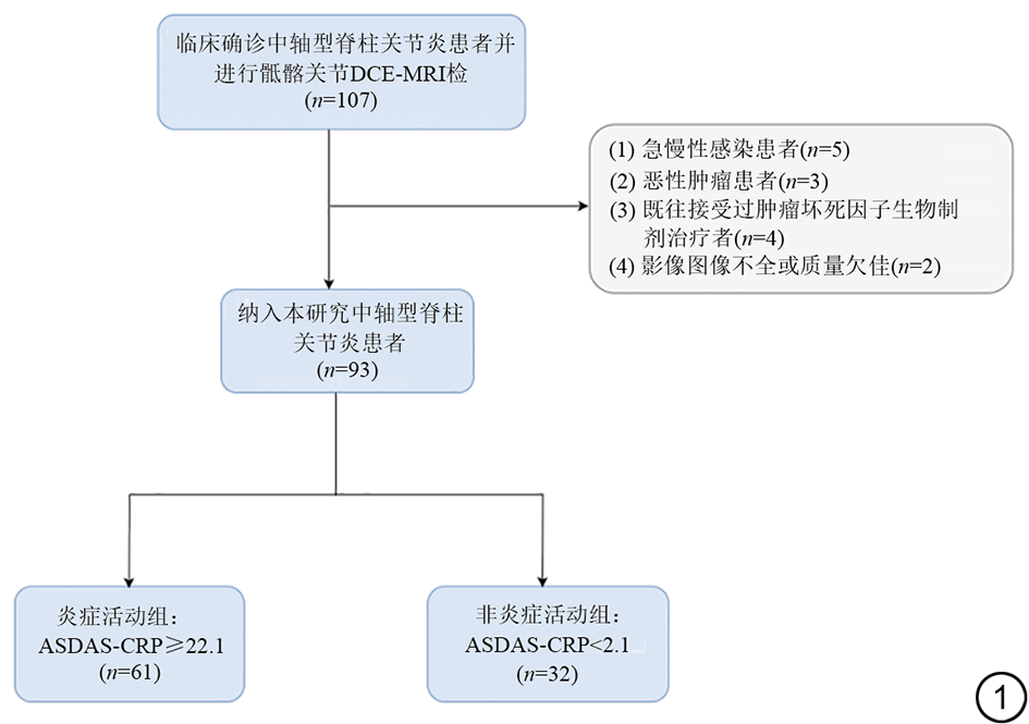 回顾性收集2014年1月至2019年6月间在中山大学孙逸仙纪念医院就诊的中轴型脊柱关节炎患者107例,并行骶髂关节DCE-MRI检查。纳入标准:(1)符合国际脊柱关节炎评价工作组(Assessment of Spondyloarthritis International Society, ASAS)于2019年修订的中轴型脊柱关节炎分类及诊断标准:①腰背痛≥3个月,且发病年龄<45岁。②MRI或X线提示骶髂关节炎+≥1项脊柱关节病特征;或人类白细胞抗原B27(HLA-B27)阳性+≥2项脊柱关节病特征。(2)行骶髂关节DCE-MRI检查。排除标准:(1)急慢性感染期患者,乙肝或丙肝活动期患者;(2)恶性肿瘤患者;(3)既往接受过肿瘤坏死因子(TNF)生物制剂治疗者;(4)心肝肾功能不全者,无法耐受对比剂注射;(5)MRI图像质量不合格。最终纳入93例患者进行分析(图1)。
