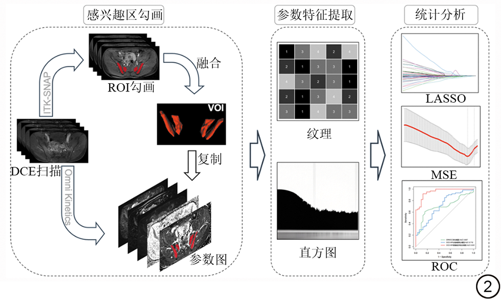 图2  研究流程图。DCE-MRI扫描后,通过Omni-Kinetics软件生成Ktrans等参数图,并利用ITK-SNAP软件在Slice参数图上勾画VOI,并将其复制至其他参数进行影像组学特征提取,然后通过交叉验证、LASSO等方法构建了不同的中轴型脊柱关节炎炎症活动性预测模型,并用ROC曲线进行效能评估。DCE-MRI:动态增强MRI;VOI:感兴趣体积;LASSO:最小绝对收缩和选择算子;MSE:均方误差;ROC:受试者工作特征。
