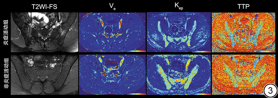 图3  中轴型脊柱关节炎炎症活动性活动组、非炎症活动性组患者MRI T2WI-FS图及DCE-MRI特征参数(Ve、Kep、TTP)伪彩图。FS:脂肪抑制;DCE:动态对比增强;Ve:血管外细胞外容积分数;Kep:反流速率常数;TTP:达峰时间。