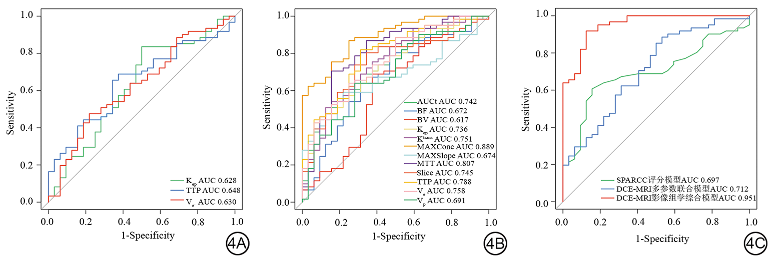 图4  不同模型对中轴型脊柱关节炎活动度的预测ROC曲线。4A:DCE-MRI参数(Kep、TTP、Ve)ROC曲线;4B:DCE-MRI参数影像组学模型ROC曲线;4C:综合模型ROC曲线。ROC:受试者工作特征;DCE:动态对比增强;Kep:反流速率常数;TTP:达峰时间;Ve;血管外细胞外容积分数;AUC:曲线下面积;AUCt:浓度-时间曲线下面积;BF:血流速;BV:血容积;Ktrans:容积转运常数;MaxConc:最大浓度;MaxSlope:最大斜率;MTT:对比剂平均通过时间;Slice:图像层面;Vp;血管内容积分数;SPARCC:加拿大脊柱炎研究联盟评分。