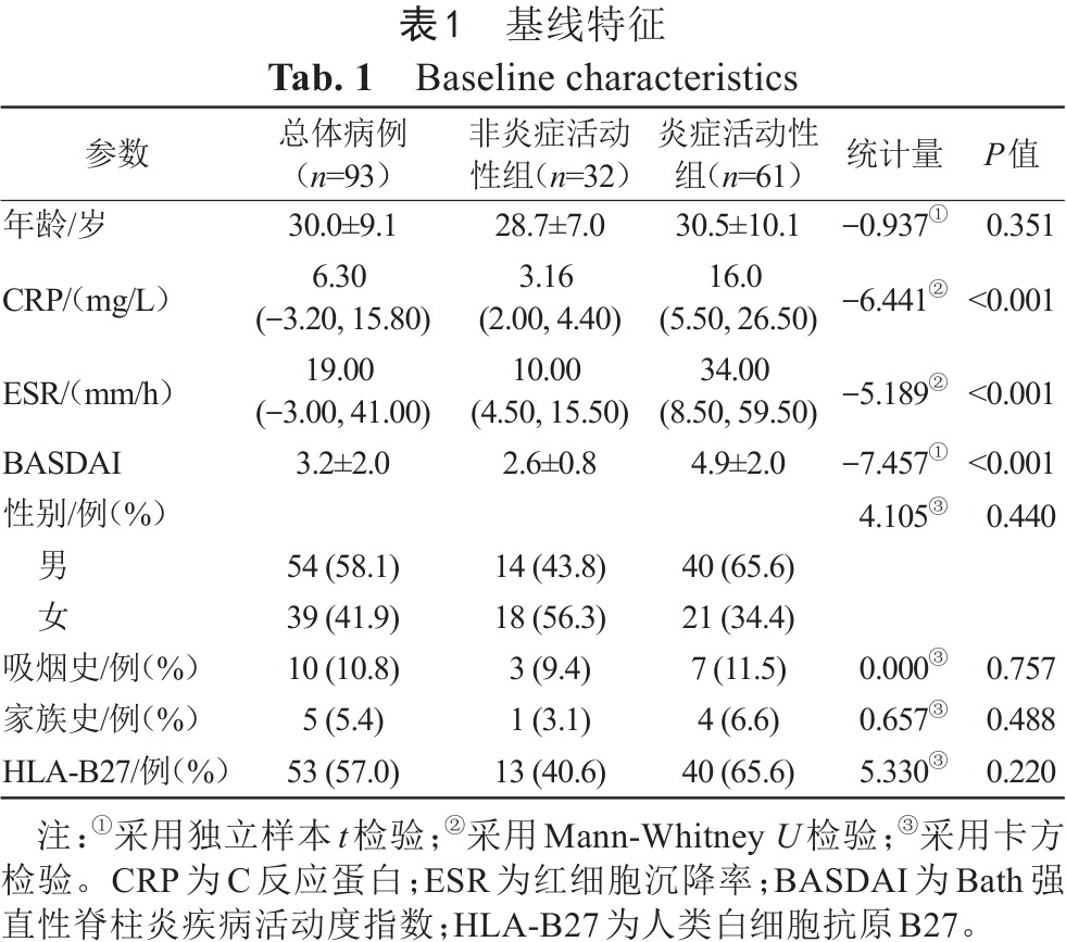 总病例数中炎症活动性组ASDAS-CRP≥2.1)61例,男女比例40∶21,平均年龄为28.7岁;非炎症活动性组ASDAS-CRP<2.1)32例,男女比例14∶18,平均年龄为28.7岁。炎症活动性组、非炎症活动性组两组组间的CRP、ESR、BASDAI评分,差异有统计学意义(P均<0.001),两组间性别、年龄、吸烟史、家族史、人类白细胞抗原B27(human leukocyte antigen B27, HLA-B27)比较,差异均无统计学意义(P均>0.05)(表1)。