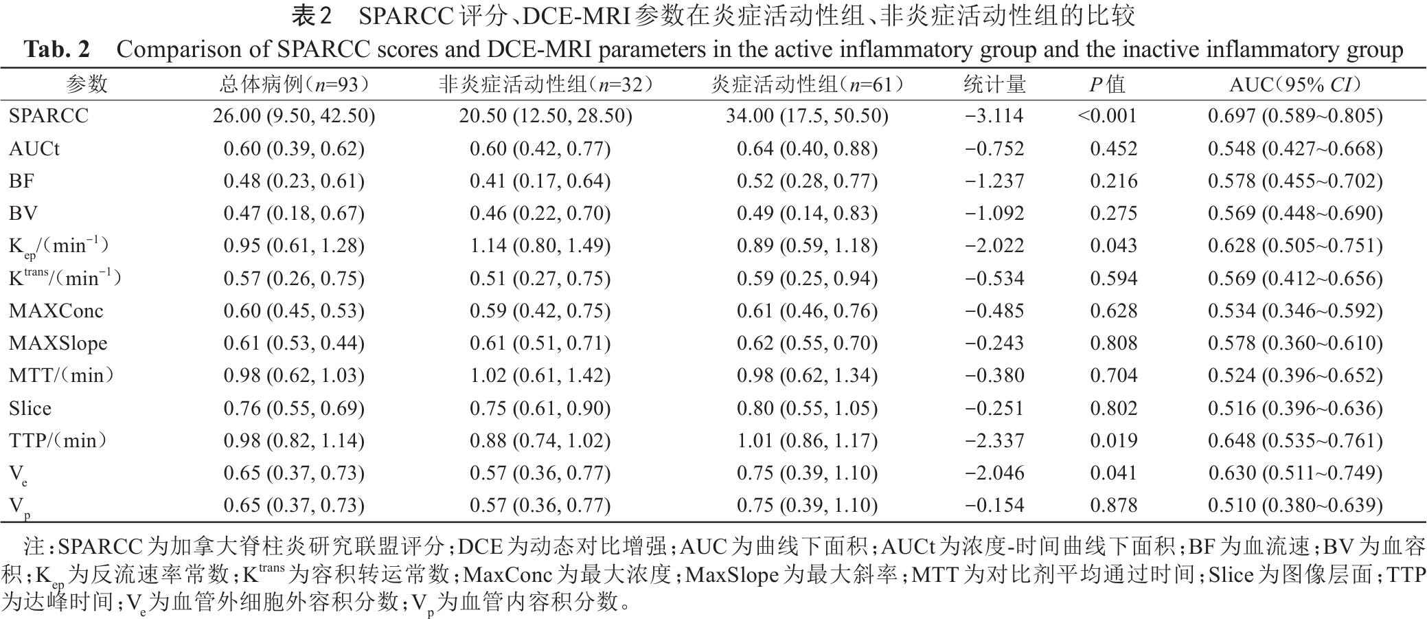 表2  SPARCC评分、DCE-MRI参数在炎症活动性组、非炎症活动性组的比较