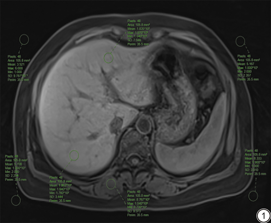 由2位分别具有10年(副主任医师)和5年(主治医师)腹部诊断工作经验的放射科医师在不知晓患者分组信息情况下,在所有患者CS-GRASP序列动态对比增强平扫、动脉早期和动脉晚期图像上,分别选取肝门静脉主干、左支及右支3个层面进行测量,在每个层面的肝左、右叶轴位中心区域、竖脊肌及图像四角各放置1个感兴趣区(region of interest, ROI)(图1),记录其信号值(signal intensity, SI)、标准差(standard deviation, SD)及图像背景噪声标准差的平均值(SD噪声),ROI放置避开较大的胆管、血管,面积约为105 mm2。分别计算肝左、右叶SI变异系数(coefficient of variation, CV),信噪比(signal-to-noise ratio , SNR),以及对比噪声比(contrast-noise-ratio, CNR)。具体公式如下: