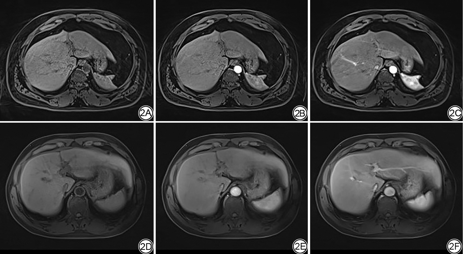 Fig. 2  Subjective scoring of the images at the level of the left portal vein regarding the noise of the left and right liver lobes, radial artifacts, image quality, and clarity of liver structures. 2A-2C: A 55-year-old male patient with unoptimized GRASP liver images, with subjective scores of 3, 4, 2, 3, 2 for the plain scan (2A), 3, 4, 3, 3, 2 for the arterial phase (2B), and 3, 4, 4, 4, 3 for the venous phase (2C). 2D-2F: A 54-year-old male patient with optimized GRASP liver images, with subjective scores of 4, 5, 5, 4, 4 for the plain scan (2D), 5, 5, 5, 4, 4 for the arterial phase (2E), and 5, 5, 5, 5, 5 for the venous phase (2F).